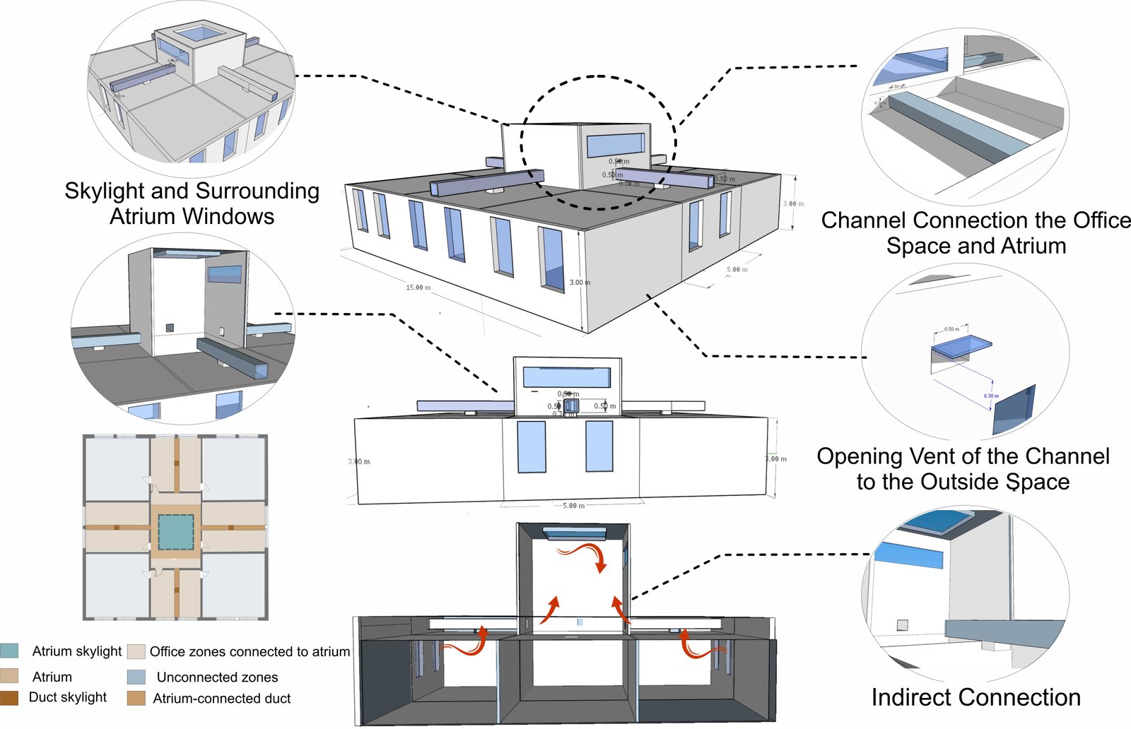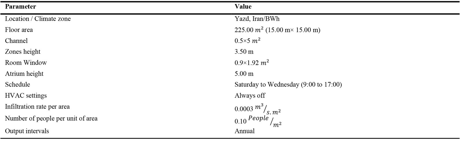 According to Table 8, the study was conducted on one floor of an office building, where the default room dimensions were 5 meters long, 5 meters wide, and 3 meters high. The atrium is assumed to be located slightly above the office space at the top of the building. Ceilings on each floor are 25 centimeters thick, and window frames in all rooms are 25 centimeters thick.