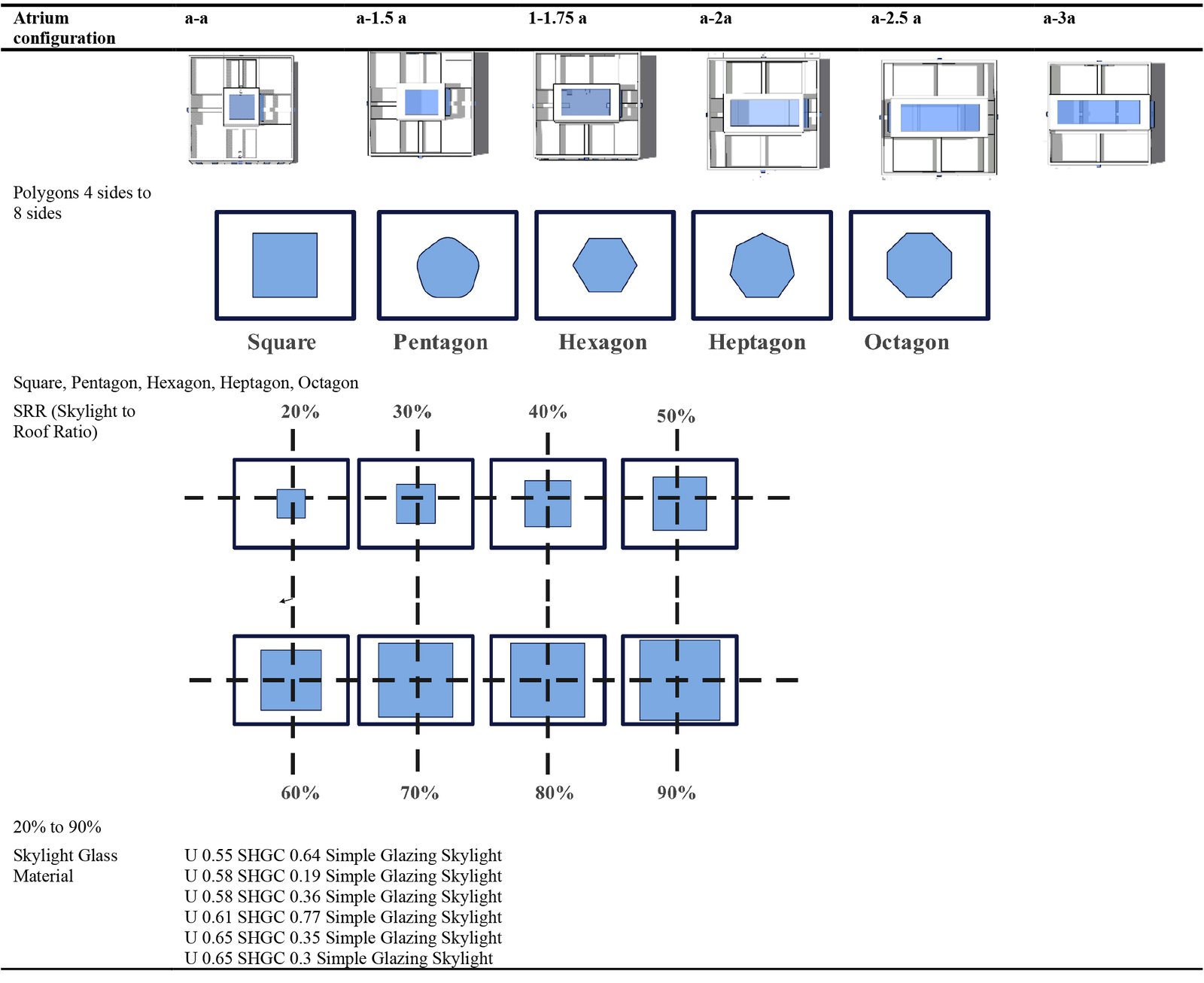 Atrium skylights were optimized by analyzing three key parameters. The purpose of this was to improve the energy efficiency and performance of office buildings. The skylight geometry, skylight-to-roof ratio (SRR), and skylight glass material are among these parameters.