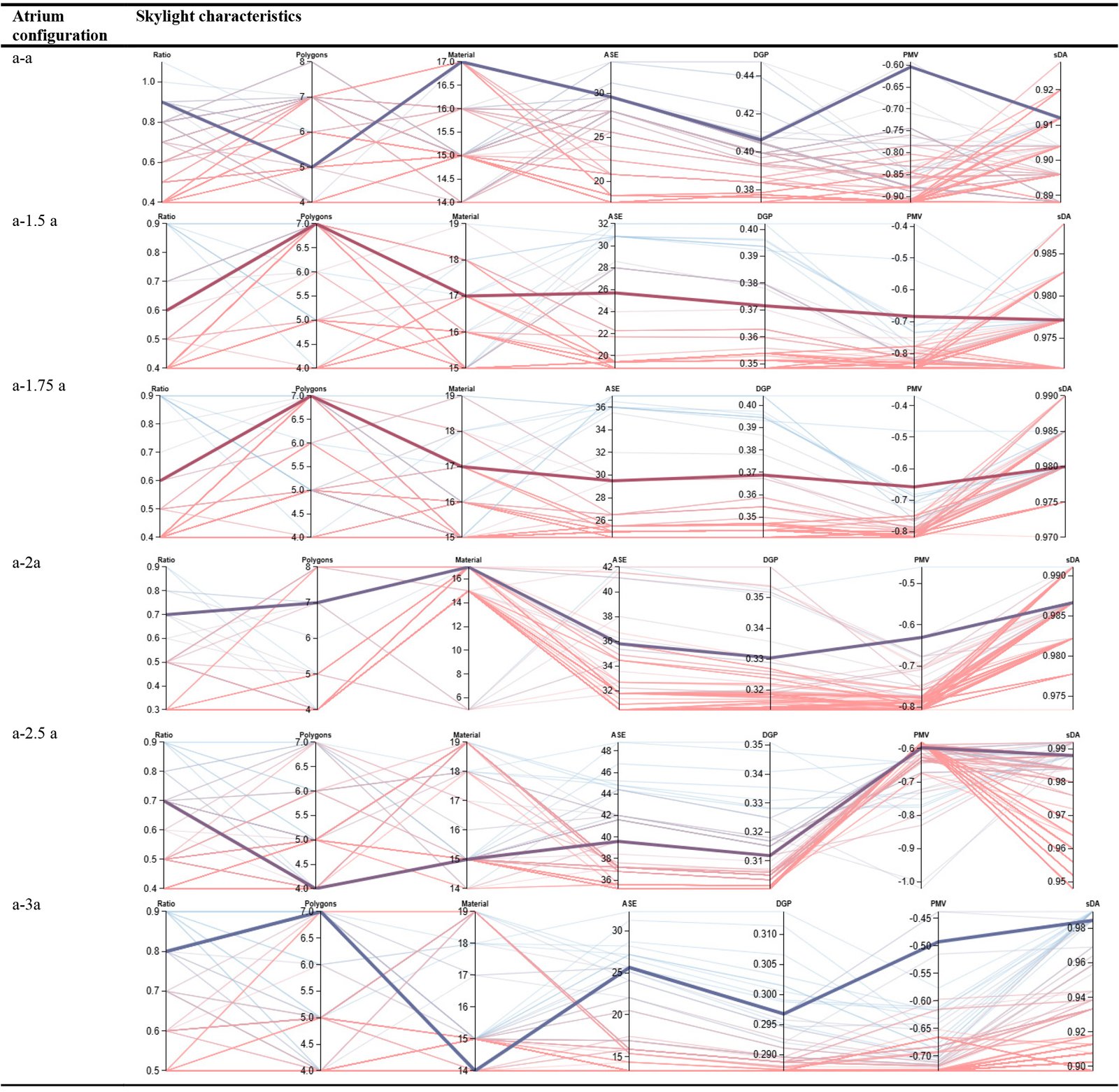 A discussion of how the atrium skylight configuration works with respect to materials, skylight-to-roof ratio (SRR), and skylight geometry is presented in this section. This study encompasses six multi-objective optimization stages, ranging from square to rectangular geometries, and considers the selected ratios. Predicted Mean Vote (PMV) and Spatial Daylight Autonomy (sDA) are maximized by minimizing Annual Sunlight Exposure (ASE) and DGP. Utilizing advanced tools such as Ladybug Tools and the Wallacei plugin, along with refined Python programming for visualizing multidimensional data, analyzing data, and comparing results, our research demonstrates a high level of technical expertise. Additionally, in this section, data was analyzed using the Design Explorer A tool. The results of the analysis are summarized in Table 12, which presents a combination of various variables with specific objectives.