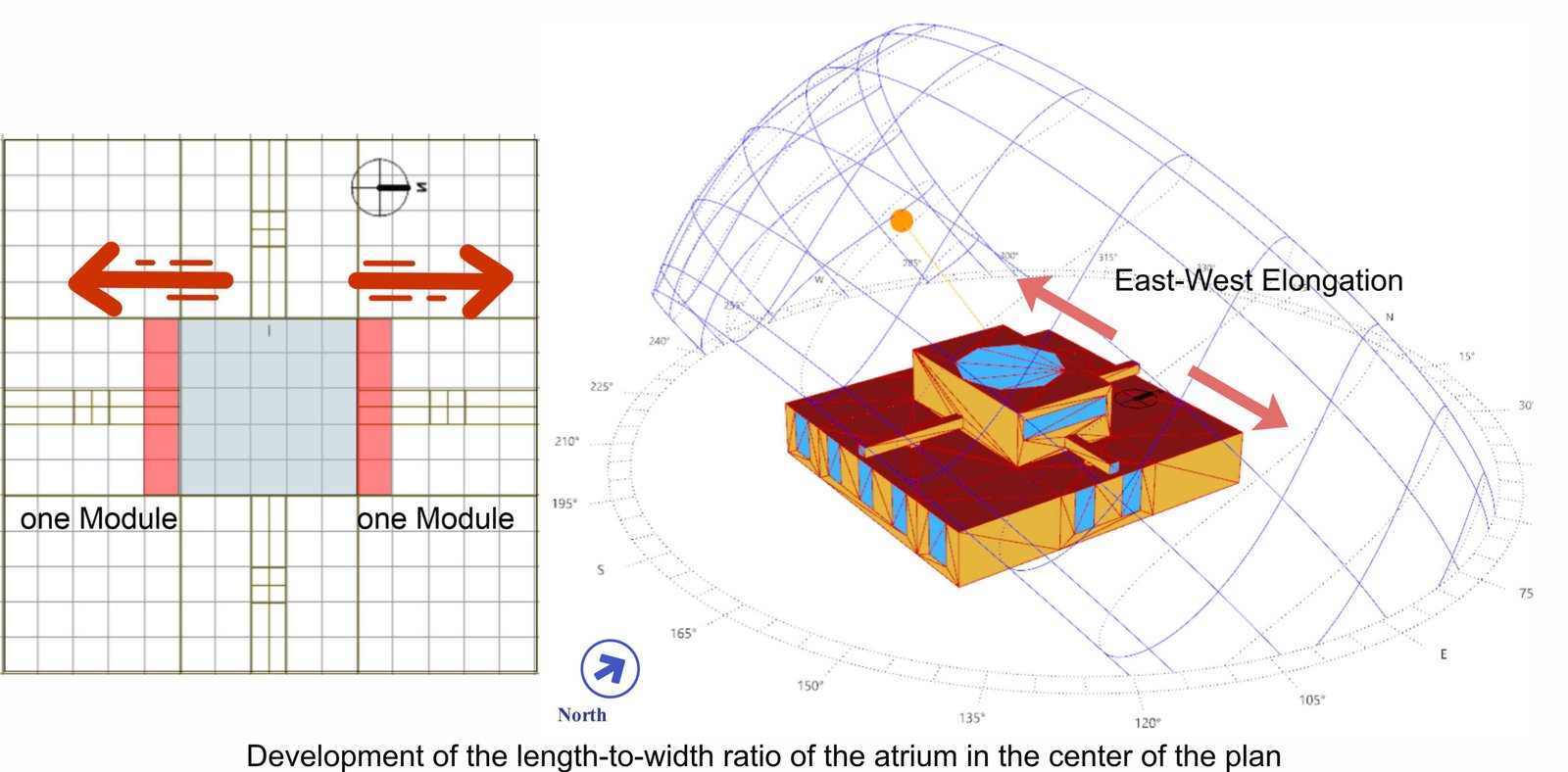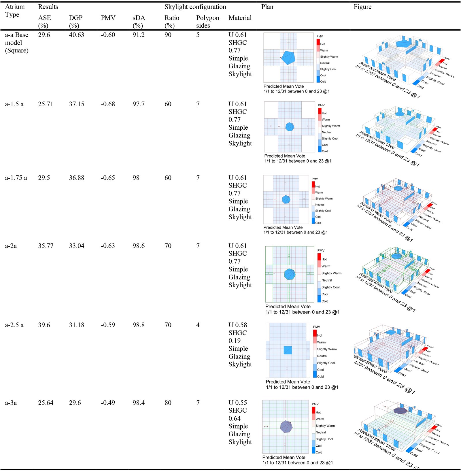 The results of the study suggest that the A-3A model, with its 3:1 ratio of length to width, is the most effective option for utilizing daylight while maintaining a comfortable temperature for its occupants. As a result of this configuration, solar heat gain is effectively mitigated, and a large amount of daylight is spread throughout the building. This is shown by its sDA of 98.4% and exemplary PMV of -0.49. As a result of its minimal glare, the A-3A model delivers the best indoor quality and reduced solar heat by maintaining optimal climatic and visual conditions. Compared to A-2.5A and A-2A, configurations such as A-2.5A and A-2A offer better daylighting performance; however, their higher ASE values indicate increased sun exposure for the occupants of the structure, which can lead to thermal discomfort. There is a clear trade-off here: designs that maximize natural light can inadvertently result in increased solar heat gain, which in turn may lead to a reduction in overall occupant comfort within the building. As a result, it is essential to consider both daylight access and thermal management when designing an atrium to ensure they are balanced.