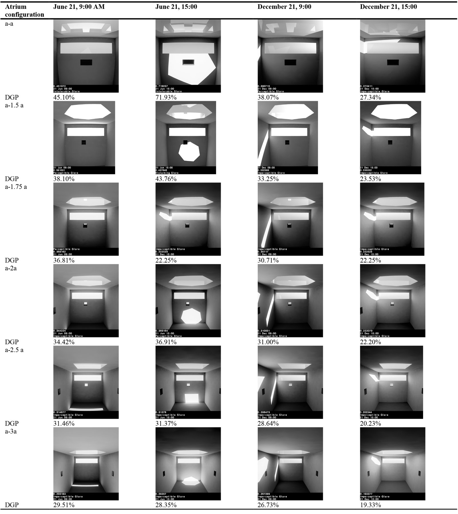Daylight Glare Probability (DGP), a metric quantifying the likelihood of visual discomfort from natural daylight glare, was calculated to assess visual comfort. This analysis aimed to validate the accuracy of previous daylight analysis methods and to determine whether glare has an adverse effect on visual comfort. The worst-case viewing position, located near the atrium skylight, was objectively analyzed. Table 14, which shows the Glare Probability (DGP) for optimized solutions, clearly analyzes the impact of different atrium geometries and design features on daylight glare in indoor spaces.