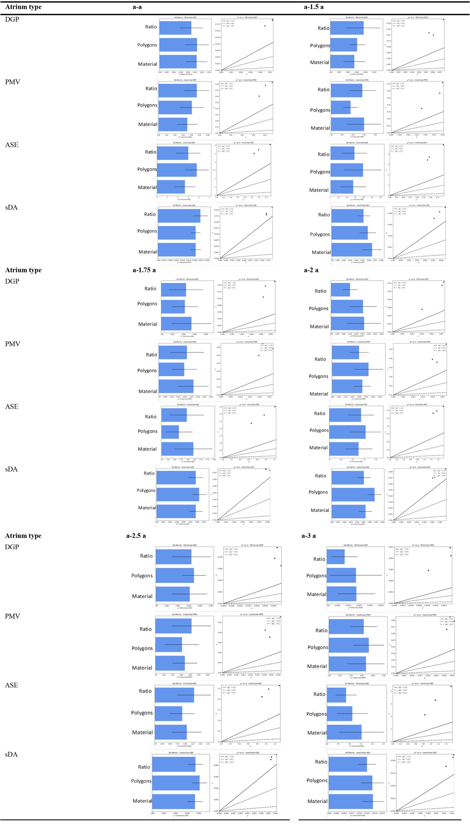 By balancing all four objectives (PMV, sDA, ASE, and DGP), Model A-3A is the optimal choice for both thermal and visual comfort, excelling in PMV and DGP, and performing strongly in sDA. Model A-1.5A is preferable if the primary design goals are to maximize daylight autonomy and minimize solar gain, as it excels in ASE and sDA, though it is slightly less effective in thermal comfort and glare control. Thus, Model A-3A is generally suited for projects seeking a high overall performance, while Model A-1.5A is better when daylight and heat management take precedence. The results and performance metrics of the optimized solutions are summarized in Table 13, which presents the key performance indicators for each atrium configuration.