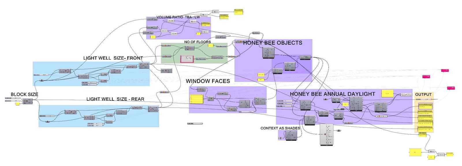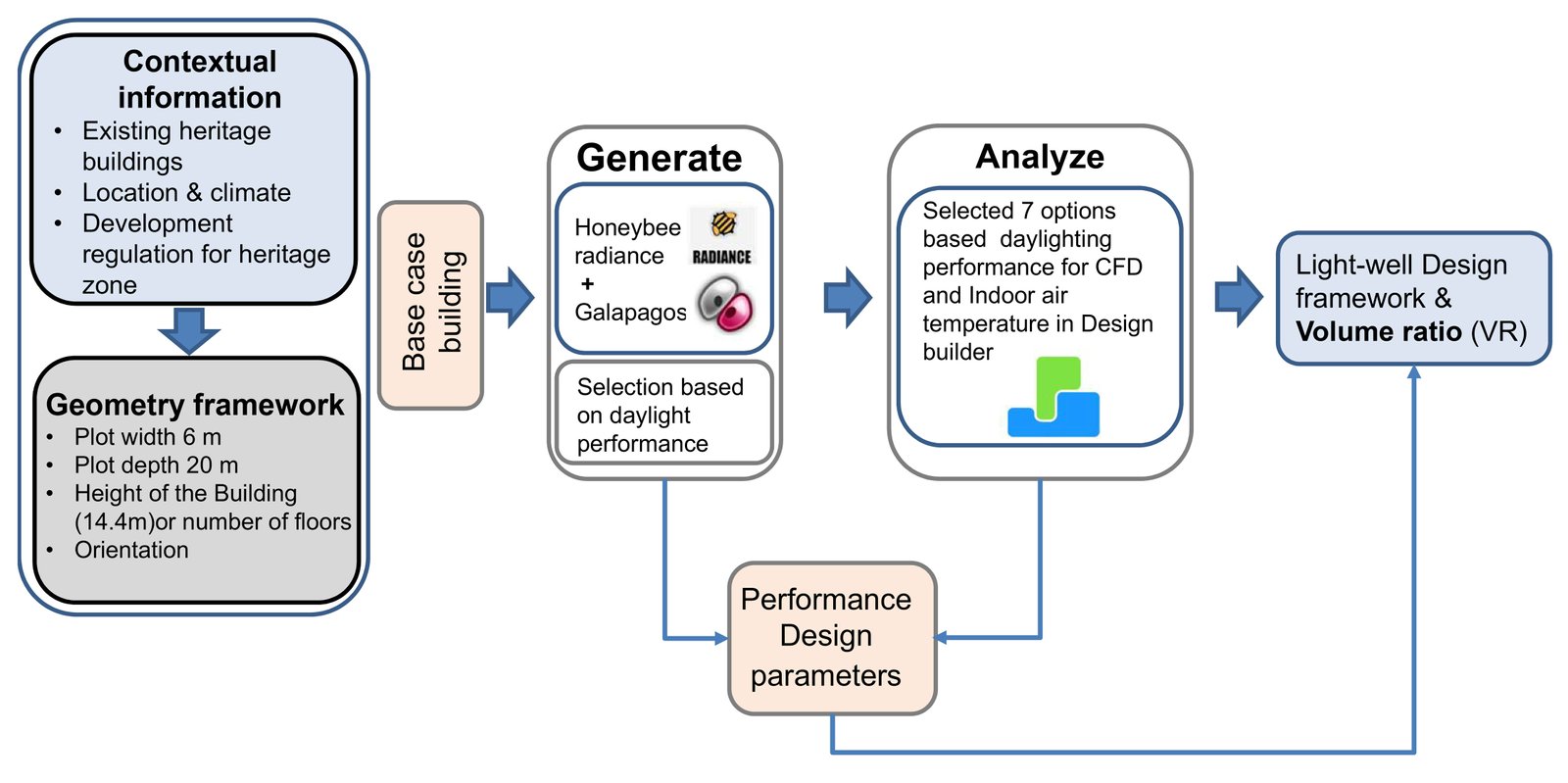 Although extensive literature exists on daylighting and ventilation performance separately, few studies have addressed their synergistic or competing effects. Integrating these two aspects is crucial because design modifications that enhance one may compromise the other. For instance, increasing the width of a light well may improve daylighting but reduce cross-airflow, whereas increasing its height may boost ventilation but reduce daylight penetration at lower levels. The lack of integrated design strategies in the literature indicates a significant knowledge gap. There is minimal research on generative or optimization-based approaches that simultaneously evaluate daylighting and ventilation performance, especially in complex urban conditions where design flexibility is constrained. With the advancement of simulation tools, environmental plugins like Ladybug, Honeybee combined with Rhino 3D, Grasshopper, and DesignBuilder with Energy plus, it is now possible to model and optimize light well performance under real-world environmental conditions. These tools enable the generation of multiple design iterations and performance evaluations using parametric and generative design methods.