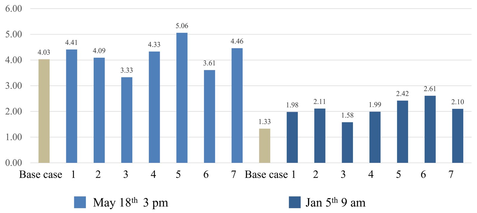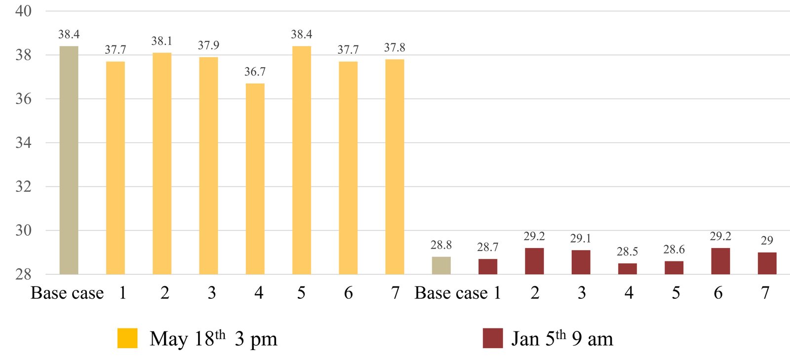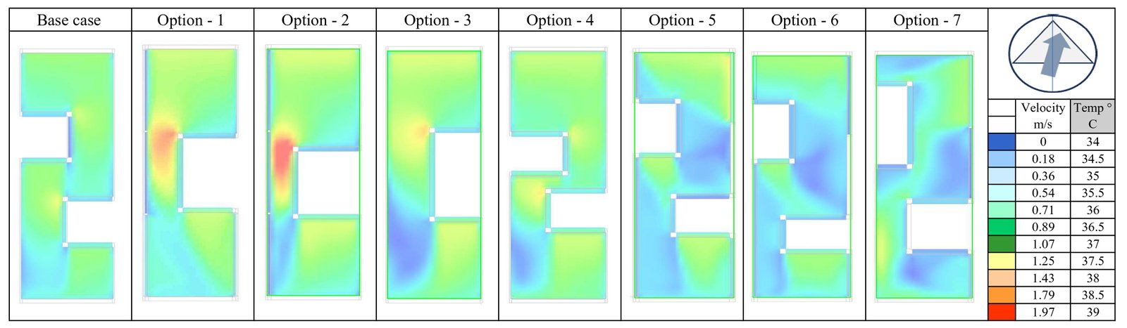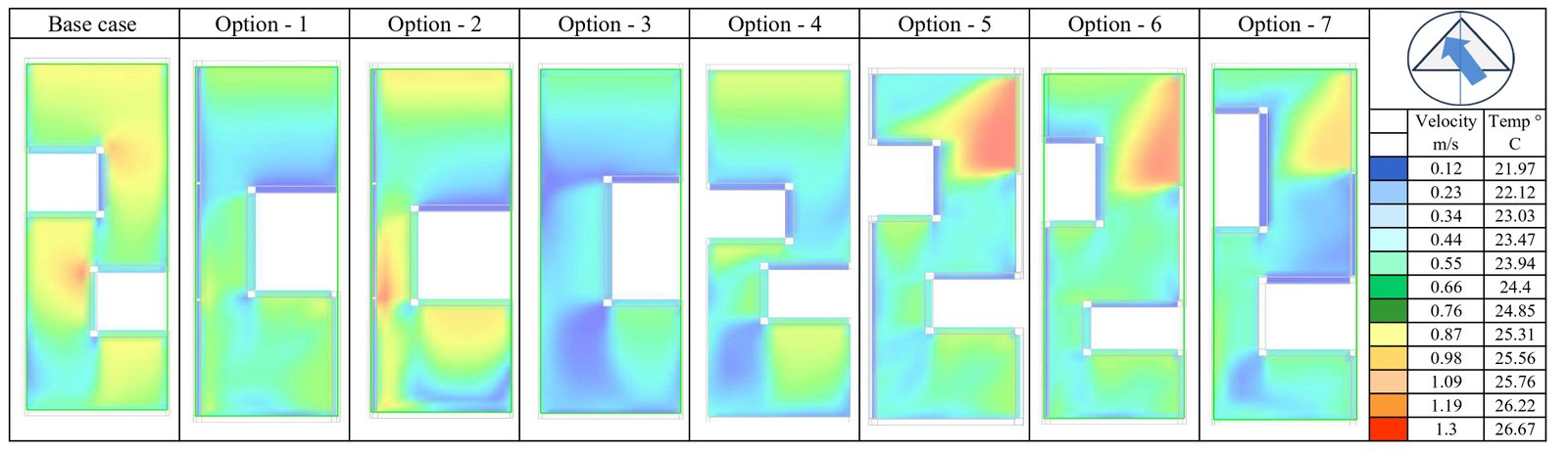 Table 5. The Mean ACH, Mean indoor temperature, and velocity-filled contour pattern for the base case and seven options on May 18th at 3pm.