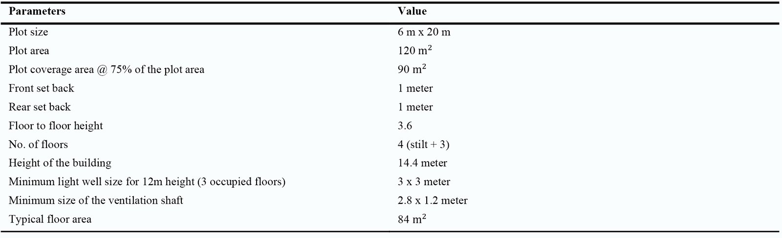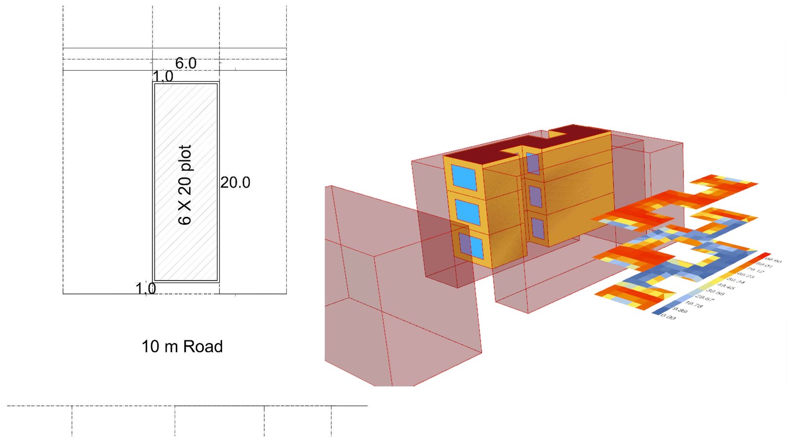 In the heritage area of Pondicherry, the existing conditions reveal that the typical deep plan width-to-depth ratio exceeds 1:3, with a minimum plot width of 6 meters. The base case model is situated on a small plot measuring 6 m × 20 m (a ratio of 3.3), featuring stilt on the ground floor for parking and three additional floors above. The front road width is 10 meters, and the total building height is 14.4 meters, with a floor-to-floor height of 3.6 meters. The minimum size of the light well is 3 m × 3 m. Two light wells are present, with an area per floor of 84 m², which is within the permissible plot coverage area of 80%. The Window-to-Wall Ratio (WWR) for openings on the front, rear, and along the light well walls is 60%. The building development control permissible planning data as in Table 1 and 3D view of the base model with the UDI heat map as in Fig. 5.