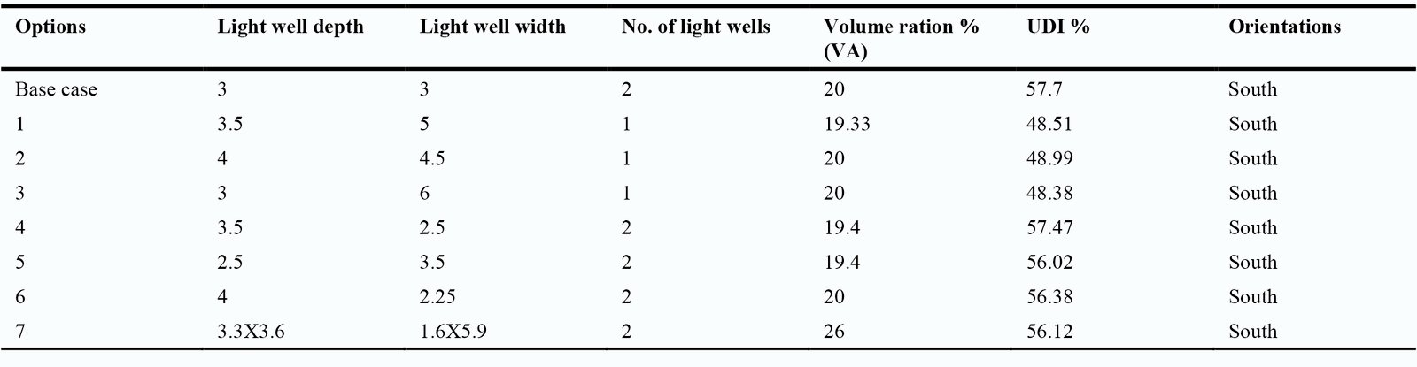 Several studies have examined the effectives of light well in improving indoor daylight availability. The geometry of light well including height, width, depth, and cross-sectional shape has been identified as a key determinant of their daylighting performance. For instance, Kristl and Krainer [1] analysed how geometric configurations influence illuminance levels using scale models and the daylight factor as a primary metric. Similarly, Amin et al. [7] introduced design modifications in light well profiles employing a wider upper and narrower lower section to improve daylight penetration in hot and dry climates, achieving better light distribution. Other influential variables identified in the literature include orientation, plan form, height and width of the light well [8-12]. In recent years, simulation-based studies have increasingly used dynamic daylight metrics such as Daylight Autonomy (DA) and Useful Daylight Illuminance (UDI) to provide more accurate performance assessments under real climate conditions. For instance, Ahadi et al. [13] investigated square-shaped light wells of varying sizes and orientations using DA as a performance criterion, highlighting the advantages of non-rectilinear configurations in deep-plan layouts.