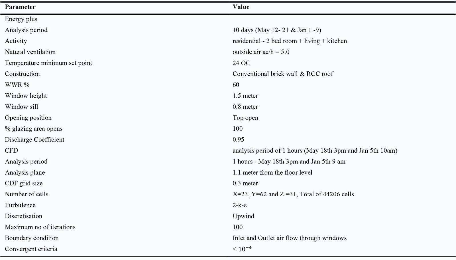 It is essential to determine the specific times when natural ventilation can potentially contribute to indoor comfort. The ventilation rate is the volume of air exchanged within a space over a specific time period, usually measured in liters per second. In this study, Design Builder 7.3.100.3 has been utilized as graphical user interfaces for Energy-Plus 9.4 and CFD simulations to predict the airflow pattern inside the deep plan for three floors without interior partitions. We tabulate floor wise and take mean of inlet and out volume in L/s (liters/ sec) as the ventilation rate, using the 2-k-ε (standard) as the turbulence model which is suitable for most indoor airflow simulations. The boundary conditions considered in this study included the inlet and outlet air volumetric flow through all the ventilation openings obtained from CFD simulation data. The convergent criteria set as residuals for turbulence and continuity, the indoor temperature and air speeds were monitored to ensure that they remain stable for 100 iterations. A simulation was run using 50,000 cells, and comparison with coarser and finer meshes showed that the results did not significantly change, proving that the solution is independent of the mesh size and numerically reliable. With the defined bondary conditions, convergent criteria and medium cells the ventilation rate is calculated for the Air Change per Hour (ACH) and indoor air temperature on each floor. The assigned value for Energy plus and CFD analysis as in Table 4.