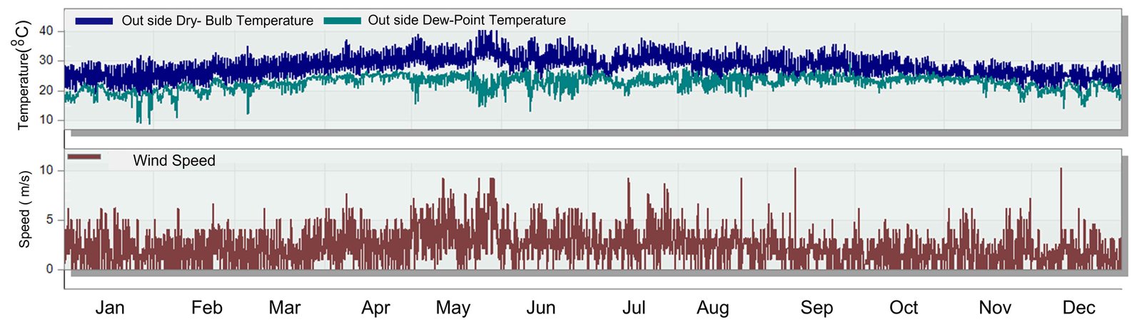 Fig. 2. Hourly weather data of Pondicherry: dry bulb temperature, dew point temperature in ºC and wind speed in m/s.