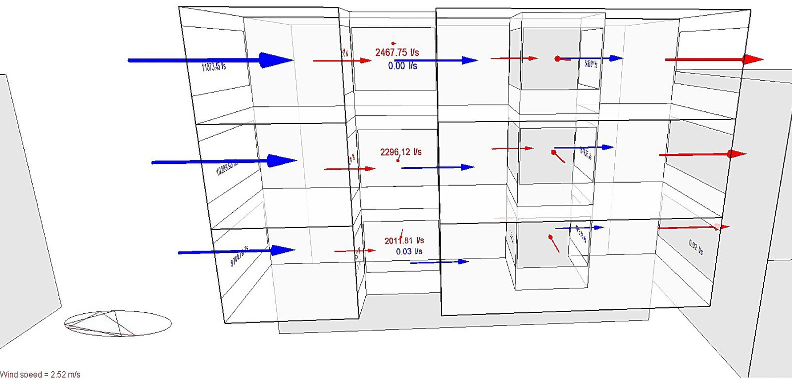 The Air Change per Hour (ACH) is a measure of how many times the air within a defined space (like a room or building) is replaced with fresh air in one hour. Which can be calculated using the ventilation rate for that analysis period with volume of each floor. According to National building code (NBC) part 8, the required air change per hour (ACH) for living rooms 3-6,