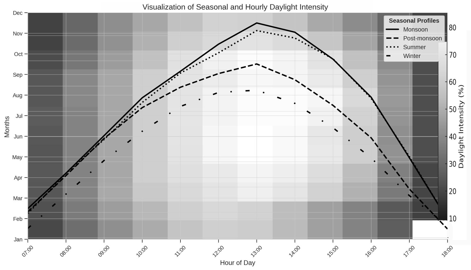 Figure 1, illustrates an integrated daylight-autonomy profile for the study area, displayed at the representative fourth-floor level to show both daily and seasonal variations. The background heatmap reveals daylight intensity, which rises sharply after 08:00 am, peaks between 12:00 noon and 2:00 pm, then decreases significantly after 4:00 pm across all months. Daylight performance varies by season. The summer season exhibits the highest average daylight autonomy of 74.8% ± 8.6%, characterised by intense midday illumination exceeding 85%. The monsoon period has comparable performance at 72.4% ± 7.9%. Post-monsoon months reach moderate levels of 68.2% ± 6.3%, while winter months are the lowest at 54.7% ± 5.4%, with midday levels remaining below 60%. The results indicate a 30% seasonal difference in daylight autonomy between periods of maximum and minimum daylight availability.