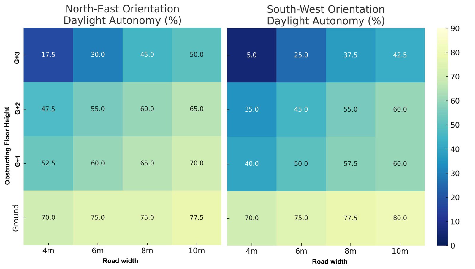 The heatmap (Fig. 14) clearly shows orientation-related differences in daylight autonomy. NE-facing layouts consistently achieved good sDA values above 45% even with G+2 obstructions. When the road width increased to 10 m, their sDA values improved further to 65–77.5%. Conversely, SW-facing layouts performed well at wider separations, reaching up to 80% sDA. However, their performance sharply declined to below 25% as the road width decreased to less than 6 m. The most critical scenario was with a 4 m road and a G+3 obstruction, where SW orientations dropped to 5% sDA, while NE orientations still maintained 17.5%.