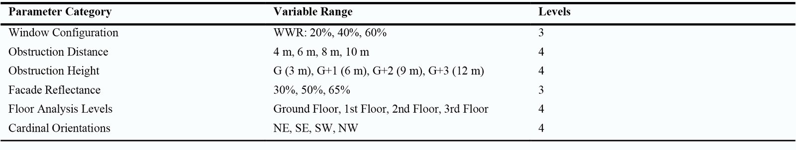 These questions guide the research methodology by connecting urban and building parameters to achieve daylight performance goals. Therefore, the study focuses on enhancing daylighting while minimizing glare in compact tropical residence environments.