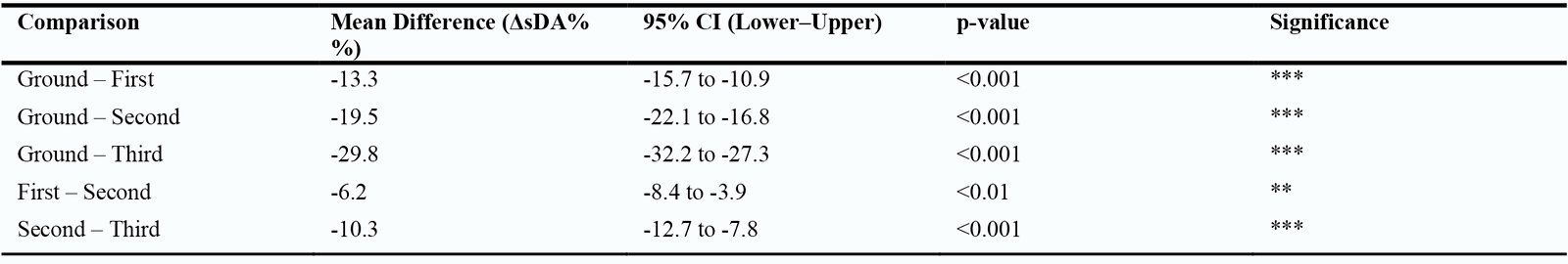 The sDA analysis revealed a clear vertical stratification pattern across all street-width scenarios. Ground floors exhibited the lowest performance with a mean sDA of 28.4 ± 5.2%, which is below the recommended adequacy threshold of 50%. Daylight levels increased on the first (41.7 ± 8.1%) and second floors (47.9 ± 7.3%), but both remained under the threshold. From the second floor upward, daylight sufficiency reached 58.2 ± 6.4%, accompanied by a noticeable rise in glare. Tukey’s HSD post-hoc tests (Table 3) confirmed significant differences between all floors (p < 0.01), indicating substantial vertical variation in daylight performance.
