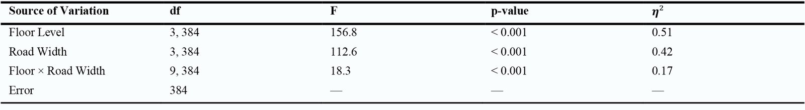 A two-way ANOVA was conducted with floor level (G to G+3) and road width (4 m, 6 m, 8 m, 10 m) as the variables. The results (Table 4) showed significant effects of both floor level (F (3,384) = 156.8, p < 0.001, η² = 0.51) and road width (F (3,384) = 112.6, p < 0.001, η² = 0.42). A significant interaction was also observed (F (9, 384) = 18.3, p < 0.001, η² = 0.17), indicating that both factors jointly influence daylight, rather than acting independently.