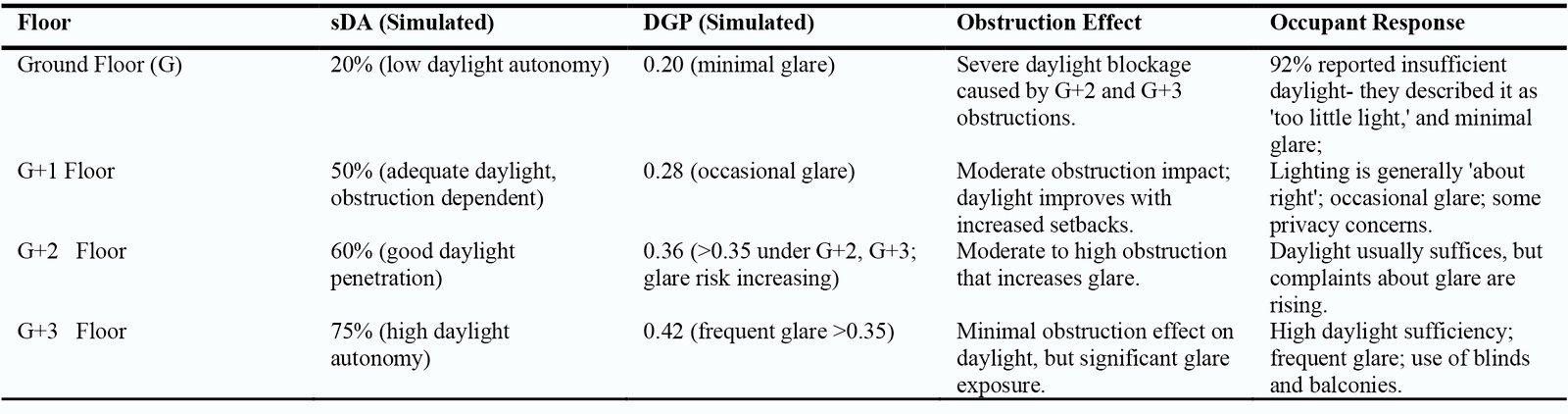 Ground floors in compact areas experience low sDA (<30%) with minimal glare, while first- and second-floor units have moderate sDA (40–65%) and higher glare levels (DGP 0.25–0.36). These results align with those reported by Chokhachian et al. [73] and Nasrollahi & Rostami [1]. Additionally, this study observed that upper floors achieved high daylight autonomy (sDA > 70%) and persistent glare (DGP > 0.35), as noted by Chien & Tseng [68] and Koster et al. [74]. Taller G+2–G+3 obstructions reduce ground-floor daylight sufficiency (sDA < 30%) and lower mid-level glare by up to 40%, consistent with findings by Sun et al. [70], Aydin & Ünver [51], and Nasrollahi & Rostami [1]. Using height modulation and site-specific setbacks effectively balances daylight access and visual comfort, as noted by Ng [77]. This confirms that obstructions serve as contextual regulators rather than mere barriers, influencing both daylight adequacy and comfort. In line with previous research, this study demonstrates that daylight levels vary by floor height and emphasizes that daylight design should be tailored to local conditions.