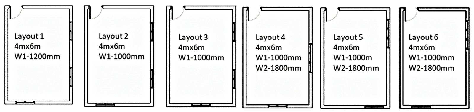 Simulations were conducted using six typical room layouts from local residences, with fenestration meeting the standards set by the Central Public Works Department (CPWD) in India. The layouts analyzed in this study are shown in Fig. 2. These configurations are based on standard window placement practices observed in the study area. The room size remains constant at 4 m × 6 m, but the layouts differ in window size and placement. These configurations were then modeled and simulated using standardized sky conditions to assess daylight access and occupant visual comfort across the floor level. The simulation considered an obstruction height of up to 15 m, which corresponds to the maximum building height allowed under local standards set by the Directorate of Town and Country Planning (DTCP, India), permitting structures with G+3 floors or stilt plus four floors. As a result, external obstruction scenarios include height variations from ground floor level (G) up to 12 m or three additional floors (G+3), along with distance variations that reflect typical urban setback constraints.