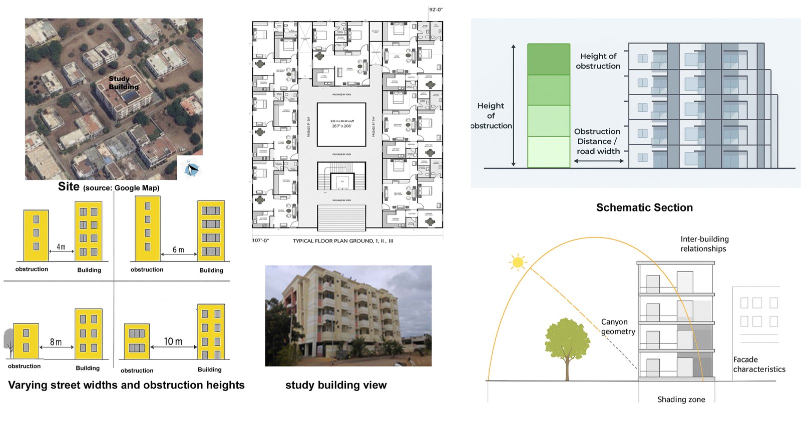 Comparative analyses were conducted to examine the relationships among glare, obstruction variables (e.g., surface reflectance, height, and distance from the building), and visual comfort, as measured by a questionnaire survey. The relevant building contexts are shown in Fig. 3, including: (a) the site plan, (b) the typical floor plan, and (c) a building section illustrating obstruction heights (G to G+3) and the road width.