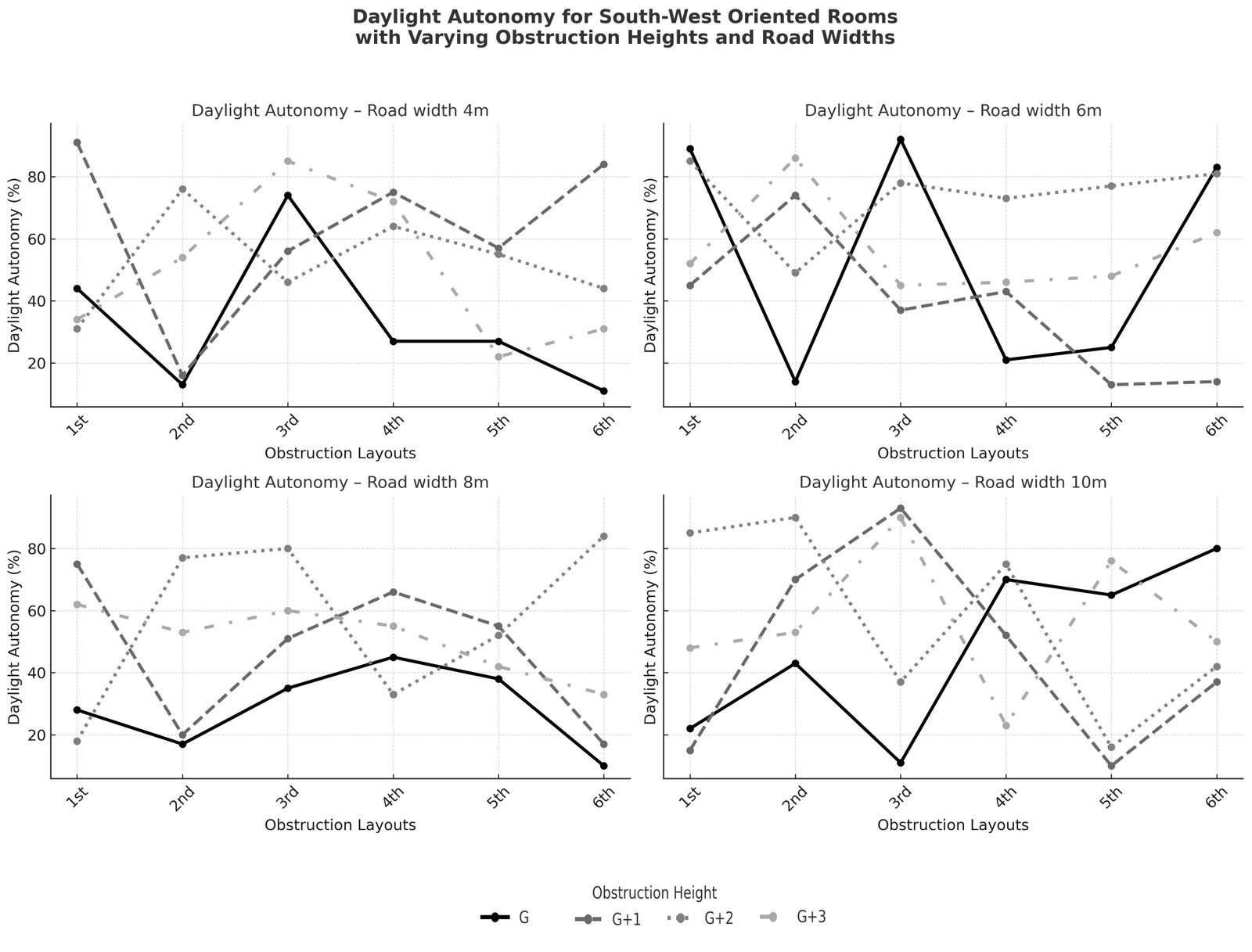 Figure 4, illustrates how obstruction height (G, G+1, G+2, G+3 floors) and road width (4 m, 6 m, 8 m, 10 m) together influence daylight autonomy (DA) in rooms facing northeast. The comparison across the six layouts reveals clear differences in daylight performance. A narrow 4-meter-wide road with taller obstructions (G+2 or G+3) causes sDA values to drop below acceptable levels. This highlights how dense urban environments limit access to daylight. In contrast, layouts with wider road setbacks of 8 m or more tend to have more stable sDA values. Even when surrounded by taller obstructions, these layouts still achieve adequate daylight. This shows that increased urban spacing improves daylight access. In north-east-oriented layouts, numbers 1, 3, and 4 demonstrated higher daylight autonomy when obstructions were placed 8 m and 10 m from the building. Conversely, nearby obstructions caused a significant decrease in daylight on the ground, first, and second floors. Under these conditions, Layout 4 performed relatively better, while Layouts 5 and 7 consistently showed poor daylighting results across all tested scenarios.