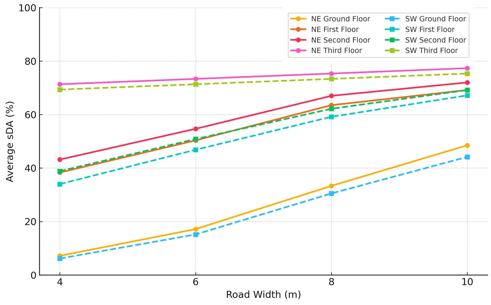 Figure 7, shows the relationship between obstruction sensitivity and sDA across different road widths and orientations (NE and SW). Figure 7, indicates that obstruction height has the most significant impact on narrow roads (4 m wide), where steep slopes result in very low sDA values (<30% to 35%). As the road width increases, the slopes become gentler, reducing the impact of obstruction height. Consequently, sDA values improve, with NE layouts reaching approximately 65% to 80% and SW layouts around 55% to 70% at a 10 m width.