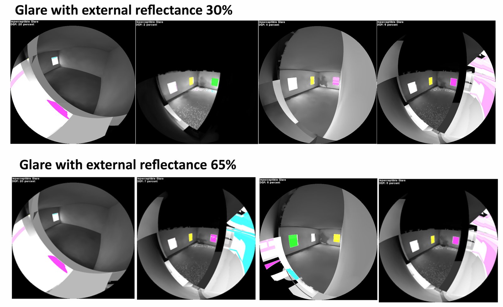 Glare performance was assessed at two external reflectance levels: 30% and 65%, representing the typical lower and upper limits of façade reflectance in the region. Figure 8, displays the results for both levels. At 30% reflectance, facade surfaces reflected minimal daylight into indoor spaces, resulting in moderate glare primarily around window areas.