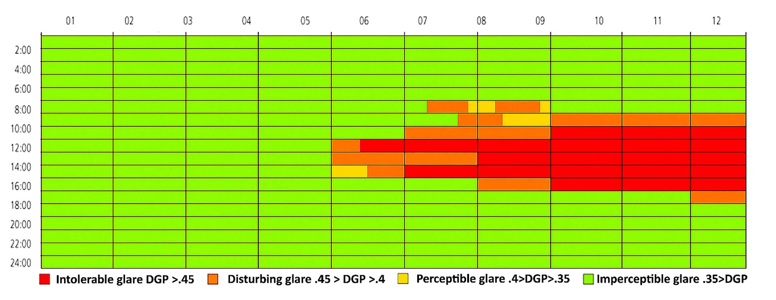 In the South-West Orientation (Fig. 10), intolerable glare (DGP 0.45) occurred from 8:00 am to 6:00 pm, accounting for about 60% to 70% of occupied hours annually. The highest glare levels were recorded between March and September, coinciding with periods of intense solar exposure. During early mornings and evenings, glare levels were moderate. Approximately 20% to 25% of the day experienced either disturbing glare (0.40 DGP 0.45) or perceptible glare (0.35 DGP 0.40). Consequently, less than 10% of the time was visually comfortable. These findings confirm that south-west orientations consistently cause glare problems, regardless of reflectance levels, making them the most significant for visual discomfort.