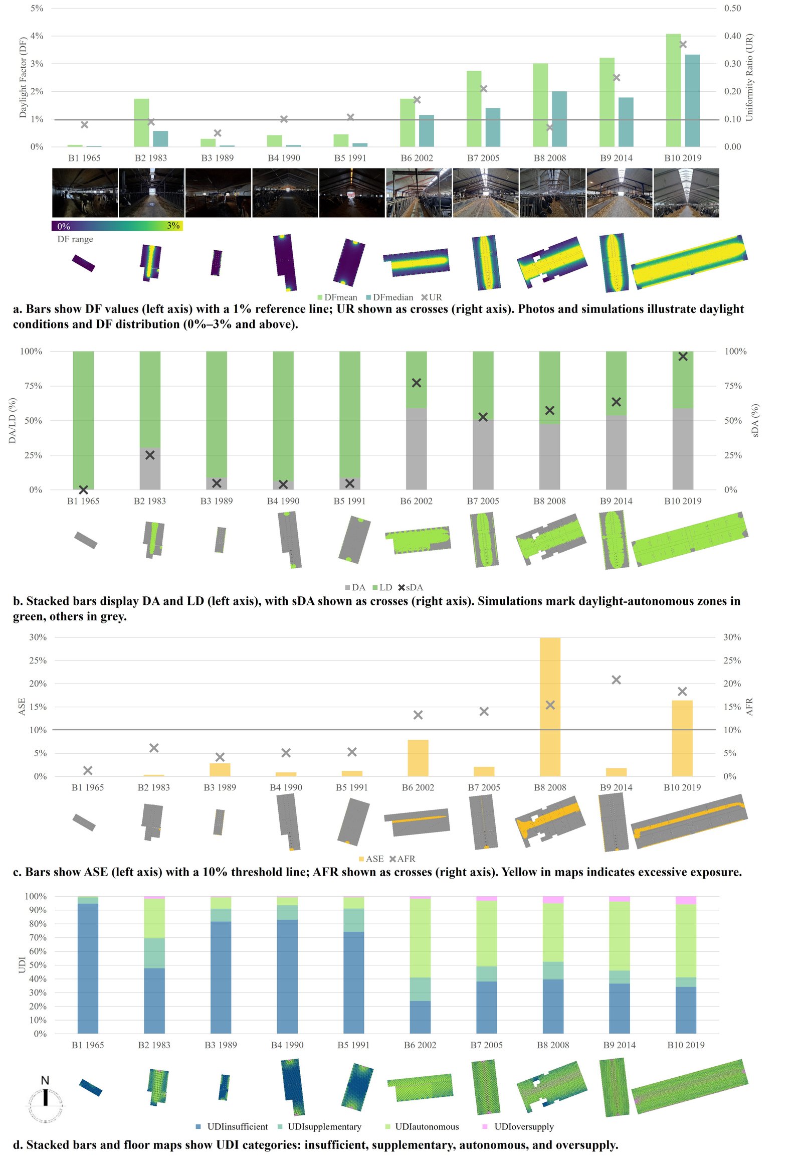 The daylighting simulation results are presented in Fig. 10. The barns are arranged by year of construction. Barn B1-B5 are constructed pre-2000s and B6-B10 barns are constructed post-2000s. The daylight analysis of the barns reveals a clear trend of improving daylighting performance in more recently constructed barns: