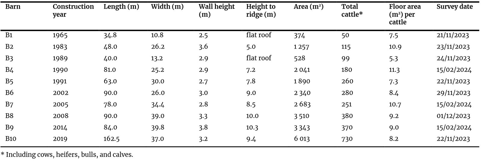 Table 2. General description of the selected dairy barns, including construction year, general geometric properties, number of cattle, and survey date.