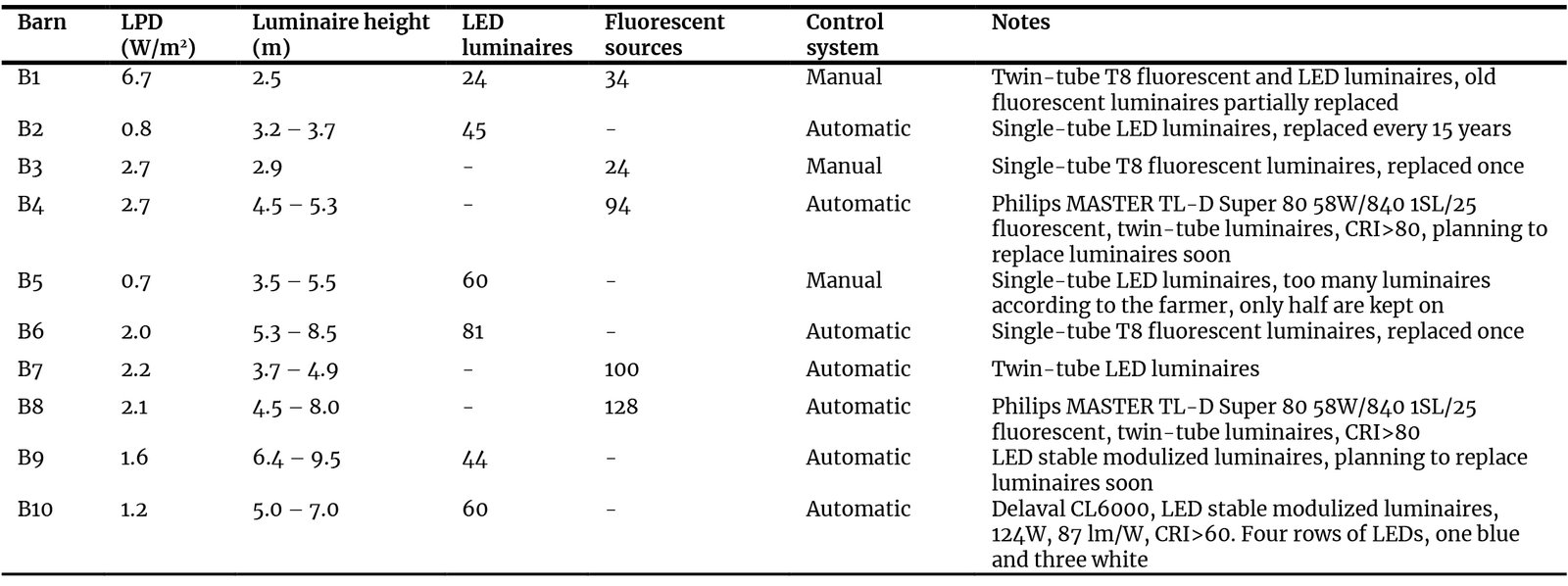 Data about lamp and luminaire types were collected at each site (Table 4). The illuminance coming from electric lighting was measured directly below luminaires on a tripod at 1.0 m from the floor. Measurements were taken during the day at the comparatively darker parts of the barns with and without the presence of electric lighting to determine the illuminance provided only by electric lighting. These data and insight from the sites were used to calibrate the electric lighting simulations, especially when the product specifications of the light sources were not available. The Lighting Power Density (LPD) of the barns was calculated using Eq. 4 [41].