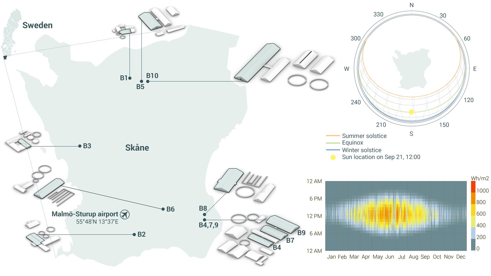 Fig. 2. The location of the dairy barns within Sweden and Skåne (left), sun path diagram showing summer solstice, equinox, and winter solstice (top right), and global horizontal radiation, highest value of 842 Wh/m2 on June 12, 12:00 (bottom right).