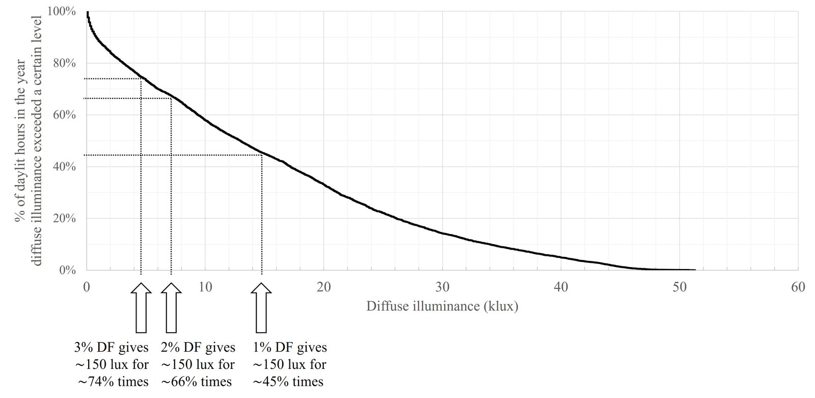 Fig. 3. Cumulative curve showing diffuse illuminance availability throughout the daylit hours of the year, used to determine the DF required to achieve 150 lux indoors. Adapted for Skåne (Sturup airport) based on an original figure by Mardaljevic, 2013 [58].