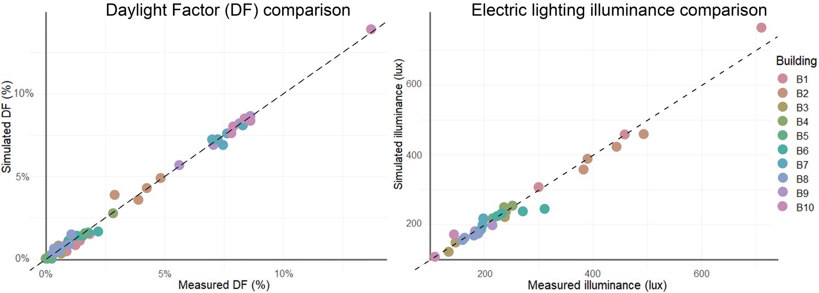 Measured and simulated DF values and electric lighting illuminance were compared across the ten barns with multiple measurement locations per building. Each point in the combined figure represents measured and simulated values of a single point, allowing direct assessment of simulation accuracy (Fig. 4). For both daylighting and electric lighting, the data showed a strong correspondence with the 1:1 reference line, R2 = 0.99 for daylight (Root Mean Square Error (RMSE) = 0.2 DF, Mean Absolute Percentage Error (MAPE) = 29.3 ) and R2 = 0.97 for electric lighting illuminance (RMSE = 20.4 lux, MAPE = 5.1 ). The higher MAPE for daylighting is attributed to the sensitivity of percentage-based errors at low DF values, where small absolute deviations result in disproportionately large percentage errors.