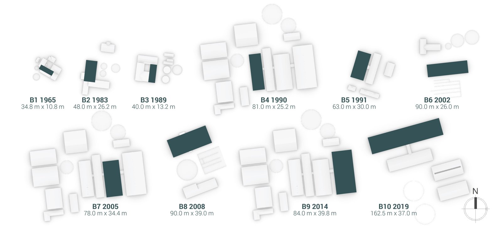 Fig. 5. Comparison of geometry and orientation between the barns. North is oriented upwards. The barns are arranged in two rows and ordered by year of construction from left to right. Dimensions are based on on-site measurements and architectural drawings provided by the farmers; cross-checked using satellite images [64].