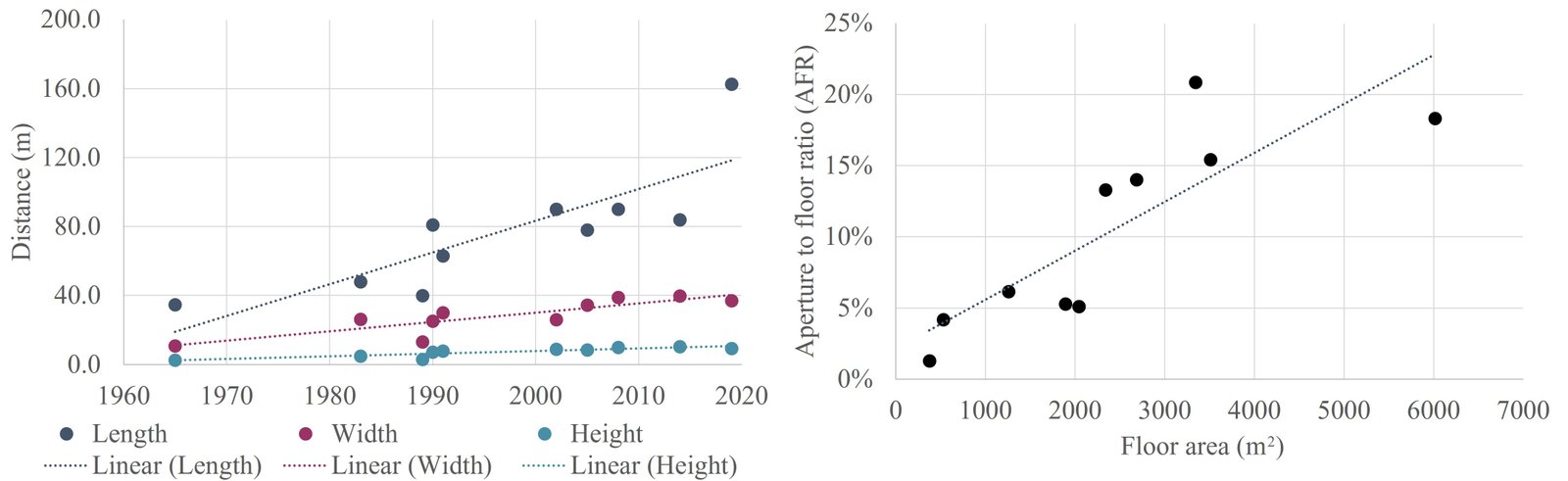 Fig. 6. Length, width and height of the barns arranged according to their year of construction (left) and the relationship between the floor area and the Aperture-to-floor ratio (AFR). Dimensions are based on on-site measurements and architectural drawings provided by the farmers; cross-checked using satellite images [64].