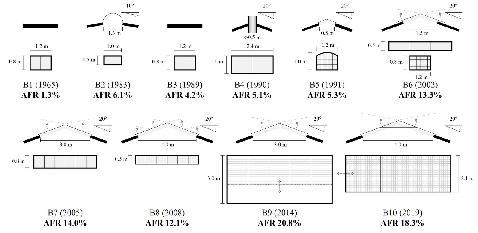 A drawing of the windows and apertures of the barns is shown in Fig. 7. The AFR in the barns through all windows, openings, and skylights are mentioned as percentages. Design practices have shifted from small windows to larger windows and clerestory or high windows, eventually leading to open facades. Skylights have evolved from non-existent to small and often non-functioning skylights, and more recently to larger skylights. AFR has increased from 1-6 in pre-2000 barns to 12-20 in post-2000 barns.