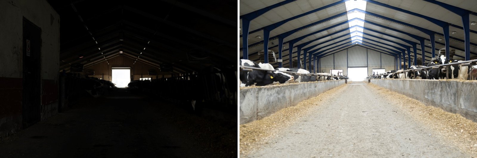 Fig. 9. Comparison of two dairy barns, B4 barn built in 1990 (left) and B9 barn built in 2014 (right), photographed with the same camera settings, same barn orientation, on the same day, and under a similar sky condition, showing the contrast created by substantially different DF.