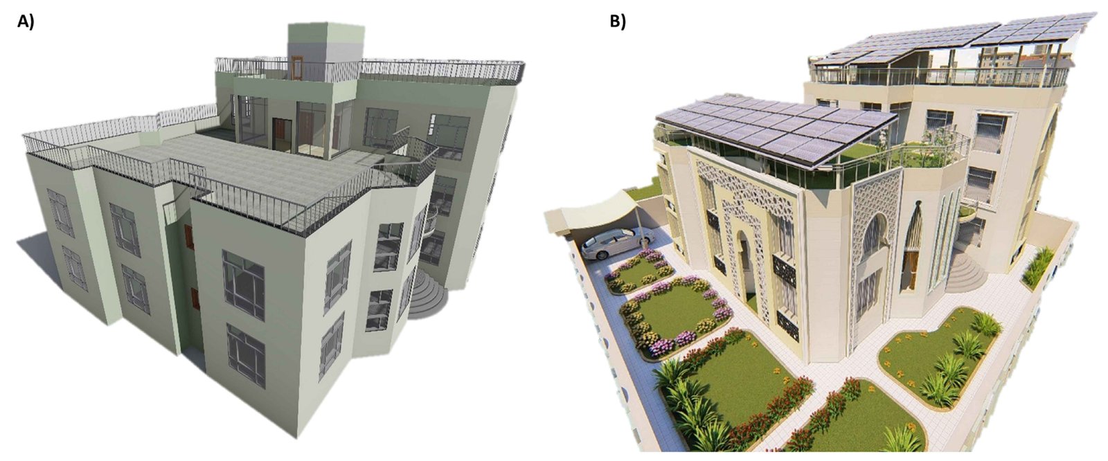 Fig. 4. Energy analysis models: (A) Traditional building typology; (B) Proposed ZEB prototype.