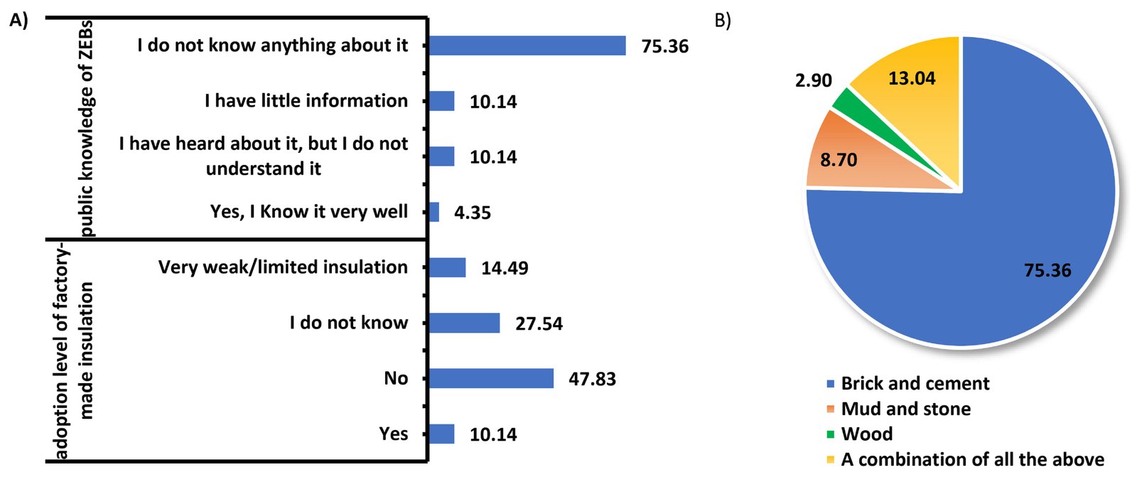 A foundational finding is the profound lack of public awareness regarding ZEB principles. A striking 75.36 of respondents reported having no knowledge of ZEBs, with an additional 10.14 having only heard the term without understanding it [Fig. 5(a)]. This indicates that sustainable building concepts have not penetrated public discourse, establishing a primary barrier to adoption that must be addressed through awareness campaigns. This knowledge gap is mirrored in building practices. While 75.36 of homes use brick and cement, indicating a move towards standardized materials, the application of energy-efficient components remains low [Fig. 5(b)]. Only 10.14 of households have installed factory-grade thermal insulation, and 47.83 use none at all, with 27.54 unaware of what insulation entails [Fig. 5(a)]. This explains the widespread thermal inefficiency of the housing stock.