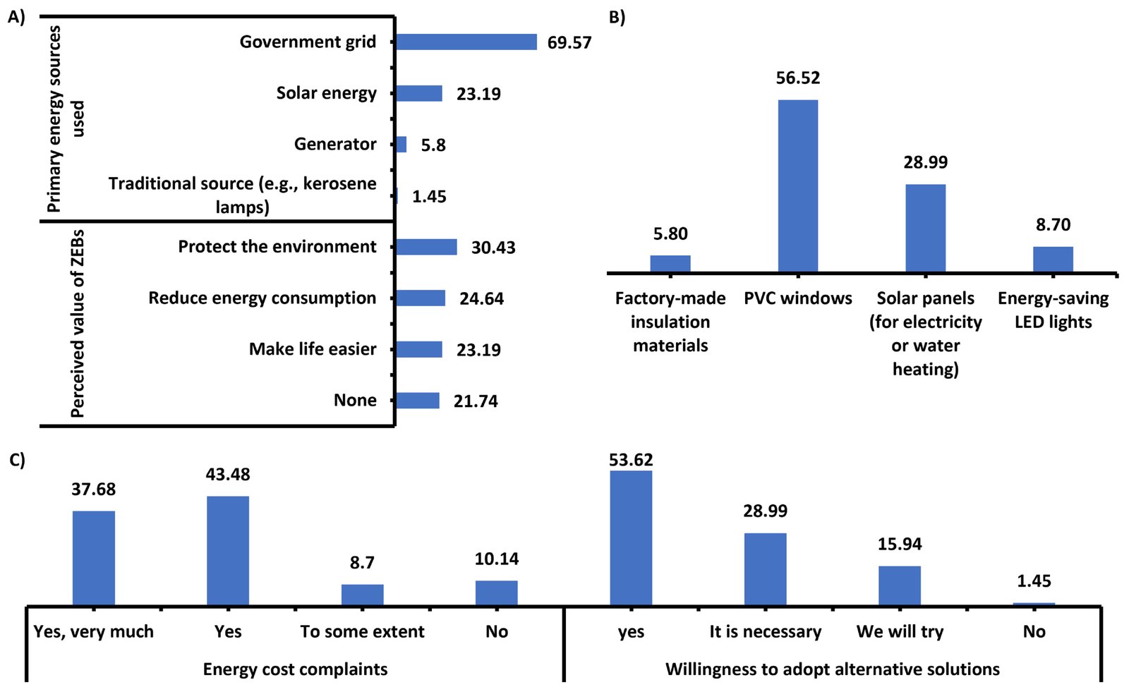 Despite these challenges, the survey reveals a strong latent potential for adopting energy-efficient solutions. While the government grid remains the primary energy source for 69.57 of households [Fig. 7(a)], there is notable openness to alternative technologies. As shown in Fig. 7A, a significant 23.19 of households already use solar energy, and 56.52% have installed PVC windows [Fig. 7(b)]. Survey data reveals that 43.48 of respondents registered a complaint about high energy costs, while an additional 37.68 reported a very high level of complaint; the sum of these two groups constitutes 81.16 of the sample who experience notable economic pressure [Fig. 7(c)]. Furthermore, 53.62 of respondents expressed readiness to adopt energy-saving alternatives [Fig. 7(c)]. Perceived benefits of ZEBs are also recognized, with 30.43 valuing environmental protection, 24.64 valuing reduced consumption, and 23.19 valuing improved living comfort [Fig. 7(a)]. However, 21.74 still see no value in ZEBs, indicating a persistent segment requiring targeted communication [Fig. 7(a)].