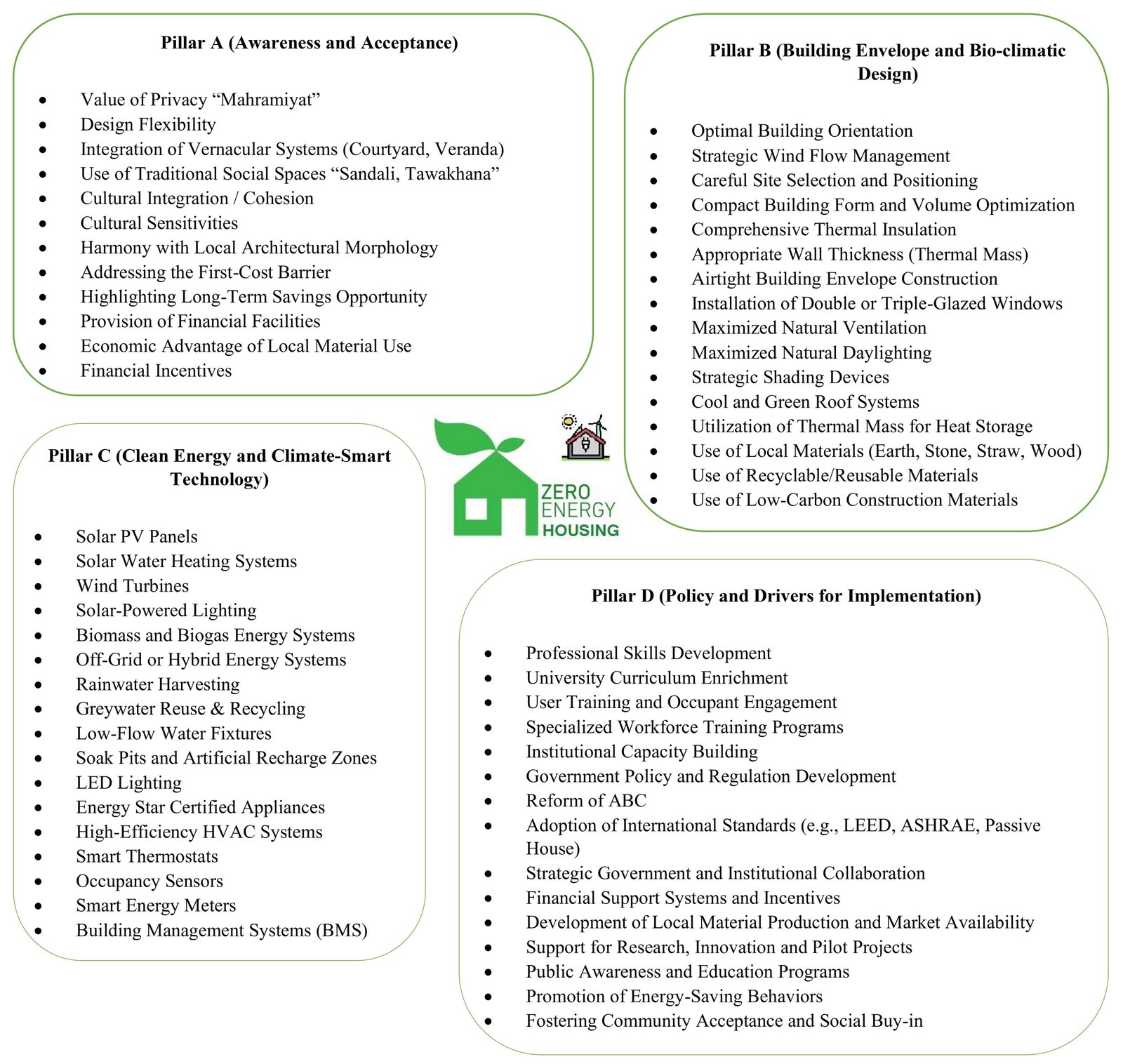 Fig. 8. The four-pillar localized design framework for ZEH in Ghazni, derived from thematic analysis of 20 expert interviews.