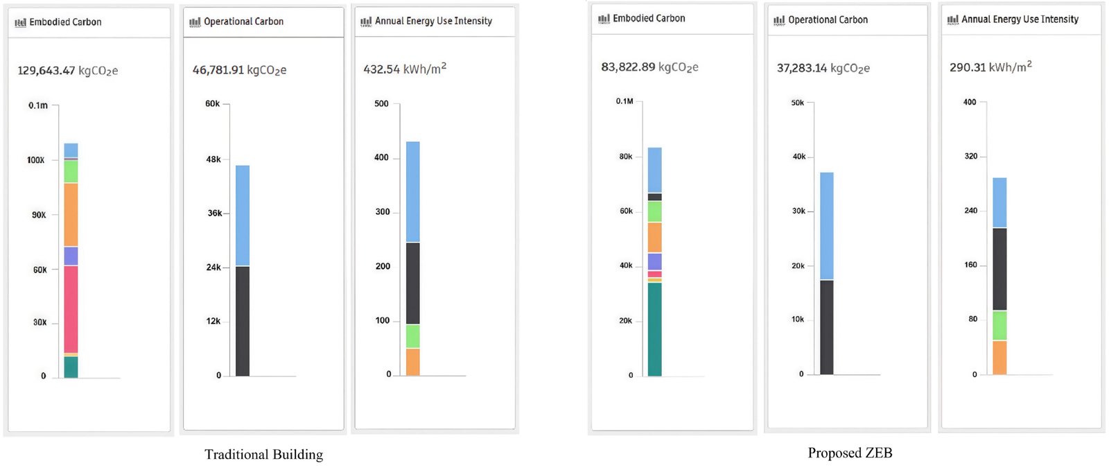 Crucially, this study advances the discourse by incorporating a lifecycle carbon perspective. The proposed design demonstrates a 35% reduction in embodied carbon (from 129643.47 to 83822.89 ) compared to the conventional model, highlighting that sustainability gains extend beyond operational energy to the construction phase itself. Most decisively, the integration of a rooftop solar PV system, with an estimated annual generation of 55012 kWh, exceeds the building's annual energy demand of 53719 kWh, achieving a net-zero operational energy balance and placing it within the ZEH category. An associated economic analysis estimates the payback period for the comprehensive retrofit at 13-15 years, quantifying the upfront financial challenge.