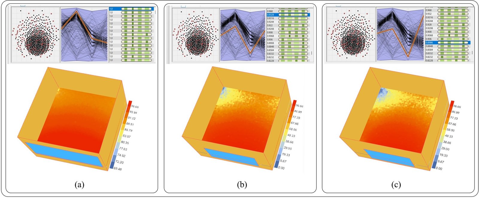 Fig. 11. (a) High-sDA optimized solution with sDA = 100%. (b) sDA = 93.28%. (c) sDA = 89.96%. Corresponding 3D perspectives and DA heatmaps are shown for each case.