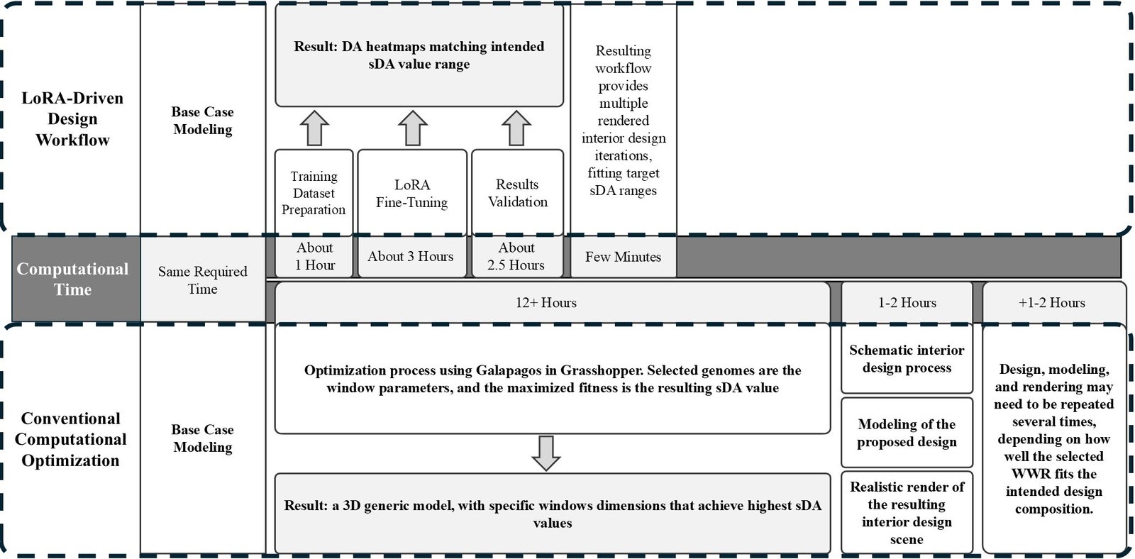 After dataset preparation, fine-tuning, and validation, the trained LoRA model became capable of generating multiple iterations corresponding to various target sDA ranges within minutes. In addition, the generated output was not a preliminary geometric model, but a complete interior design iteration delivered as a realistic rendered scene. The comparison between the two workflows is shown in Fig. 12. It highlights the advantage of the GenAI-driven workflow in reducing computation time and enabling a faster transition from daylighting targets to final visualized design iterations.