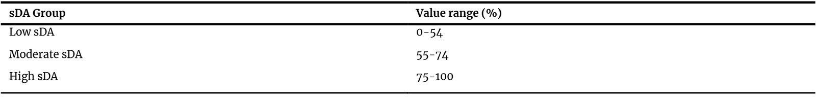 Table 3. Categorization of sDA groups applied in experiment procedures based on achieved percentage values.