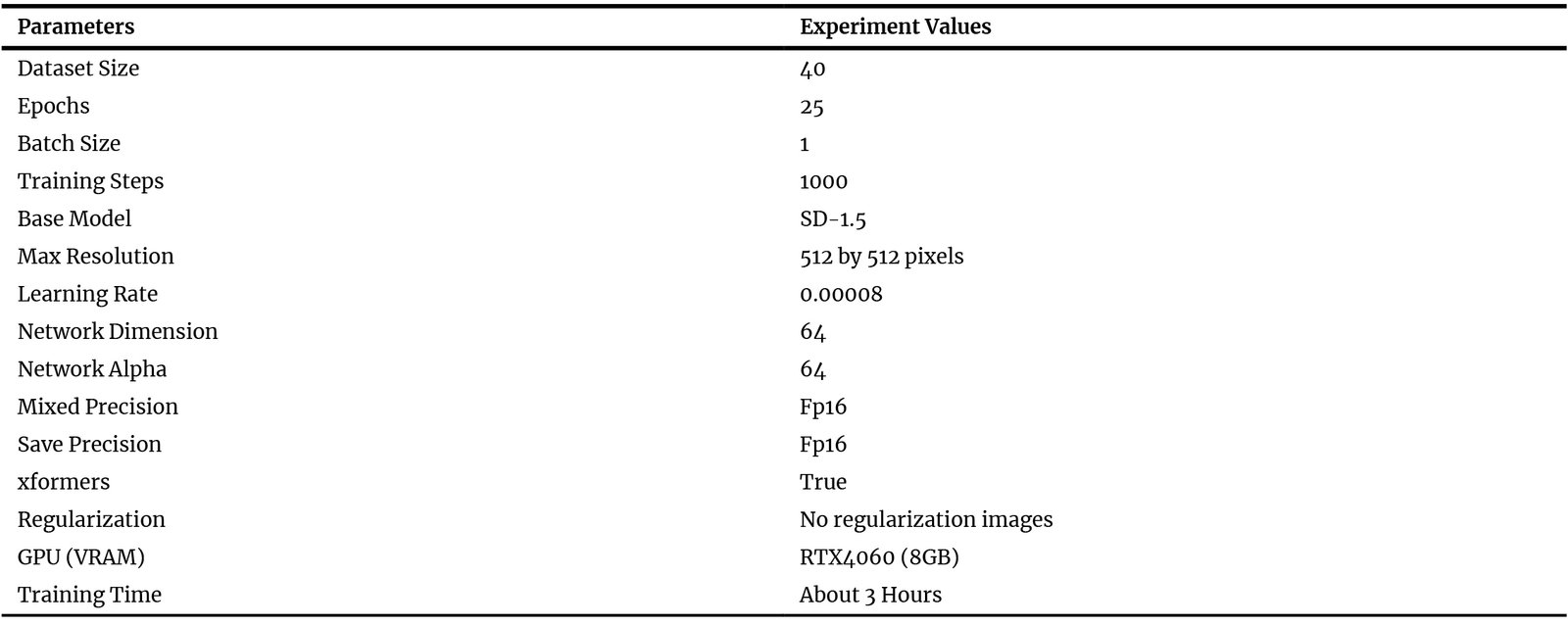 Table 4. LoRA fine-tuning parameters, dataset settings, and computational specifications adopted in the Kohya_SS GUI.