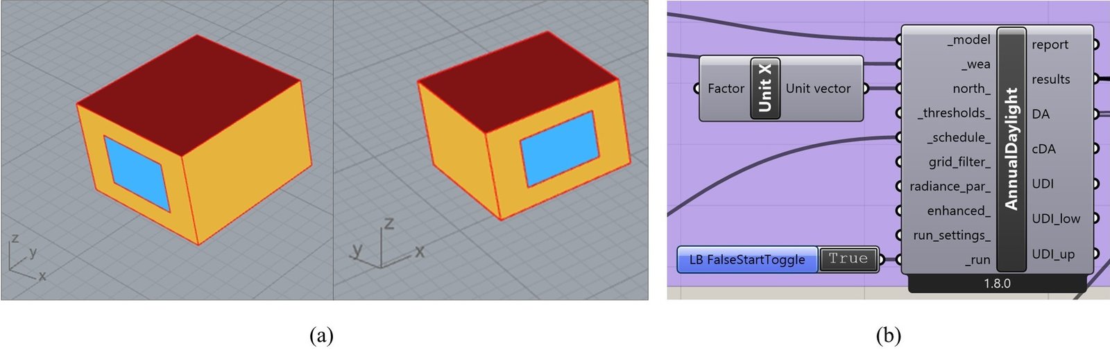 Fig. 2. (a) Screenshots from the Rhinoceros interface of the base case Honeybee model, showing the studied façade orientation with respect to the standard XYZ axes. (b) The annual daylight simulation component in the Grasshopper interface, illustrating the north orientation defined for the simulation setup.