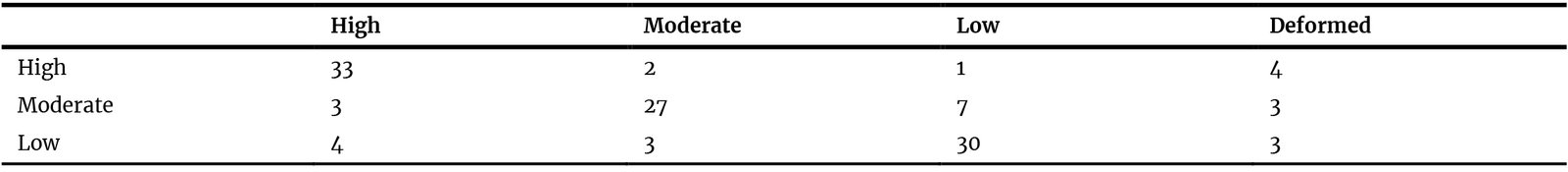 Table 8. Confusion matrix of the non-fitting LoRA-generated outputs for the three prompt keywords: “High,” “Moderate,” and “Low.”.
