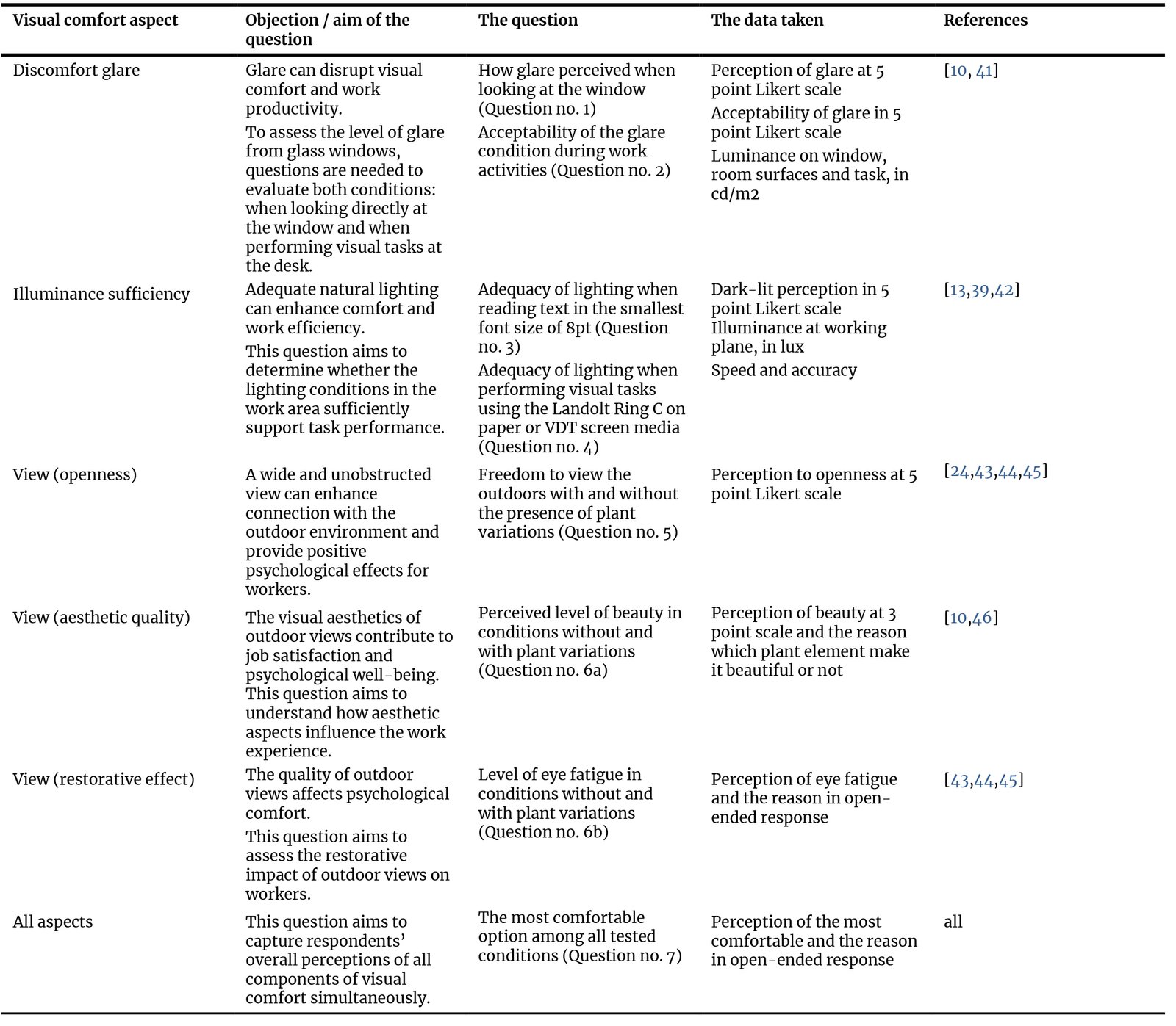The questionnaire was developed to get subjective perception of visual comfort aspects and constructed as shown at Table 1.