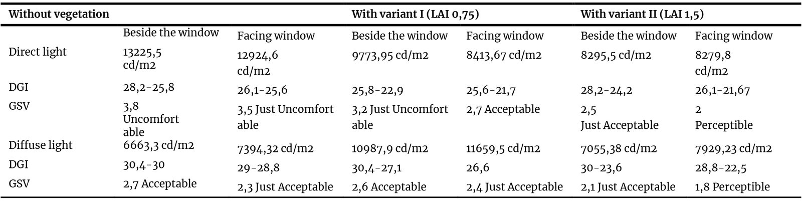 In conclusion, Table 8 presented a summary of the experimental results for the vegetated façade variants (LAI 0,75 and LAI 1,5) in relation to four key visual comfort parameters namely DF, DGI, GSV, and IV.