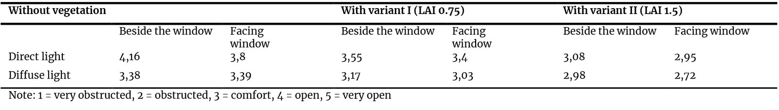 In Variant II with LAI 1,5 featuring denser foliage, illuminance is reduced by approximately 25–30% leading to lower DF values of 12,4% (side-window) and 7,3% (window-facing), both of which were perceived by respondents as Comfort. Based on the results of the previous Experiment [25], as shown in Figure 8, Variant I with LAI 0,75 shows a shading factor of up to 10% combined with a high luminance index of 45% significantly contributing to the brightness effect in the room (DF = 10,7% for diffuse light and 9,8% for direct light). In Variant II, the resulting DF values approached the recommended standard (DF = 7,3% for diffuse light and 6,2% for direct light) with a 35% shading factor and a luminance index of 30%.