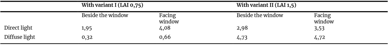 Previous publication showed that foliage thickness influenced illuminance and luminance when LAI was doubled [31]. In this experiment, Vernonia with LAI 0,75 and 1,5 was applied.